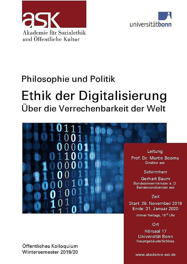 Die Tradition öffentlicher Winterkolloquien der Akademie für Sozialethik und Öffentliche Kultur in Verbindung mit der Universität Bonn geht weiter. Ab dem 29. November 2019, 16:15 Uhr geht es bis zum 31.01.2020 immer freitags in Hörsaal 17 der Universität Bonn um die "Ethik der Digitalisierung – Über die Verrechenbarkeit der Welt". Der Eintritt ist frei. Zur Veranstaltung ist ein Begleitheft erhältlich, das gegen eine Schutzgebühr vor Ort bezogen werden kann. Hauptreferent und Leiter der Reihe ist Prof. Dr. Martin Booms, Schirmherr der frühere Bundesinnenminister und ask-Beiratsvorsitzende Gerhart Baum, der auch zweimal als Gastreferent sprechen wird.